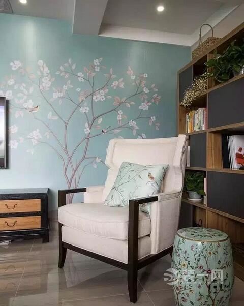 客厅最抢眼的是青绿的电视背景墙,浅粉色的花朵摇曳芬芳,让客厅充满中式的雅韵。